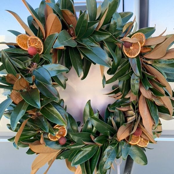 Our most popular wreath - magnolia leaves with dried orange slices and cinnamon sticks.